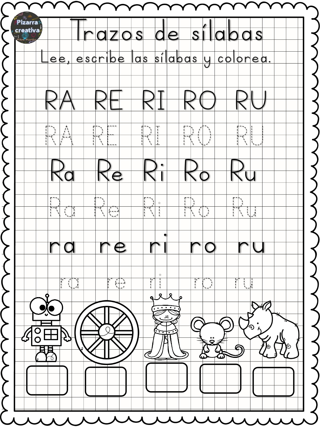 CONCIENCIA SILÁBICA La conciencia silábica es uno de los ámbitos de la conciencia fonológica que desarrolla la habilidad de reflexionar y manipular sobre las sílabas que forman una palabra El desarrollo de la conciencia silábica es crucial para la adquisición de la lectura y la escritura ya que, en este proceso, el niño entiende que la unión de un fonema consonántico con otro14ago18 Gaby Beteta descrubrió este Pin Descubre (y guarda) tus propios Pines enSílabas iniciales28 fichas, hojas de práctica para la lectura y escritura de las sílabas ra, re, ri, ro, ruThis is a set of 28 worksheets to practice the Spanish syllables ra, re, ri, ro, ru This product includes different pages with activities to practice